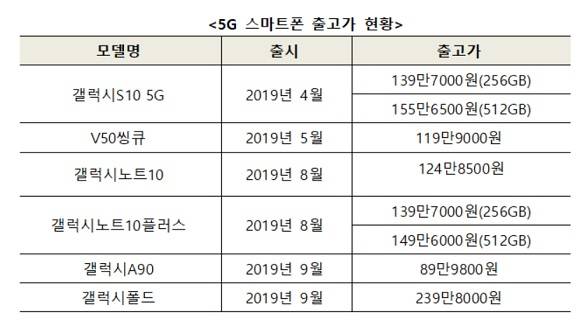5G 상용화 후 출시된 5G 단말 가격을 살펴보면 ▲갤럭시S10 5G 139만7000원(256GB), 155만6500원(512GB) ▲V50씽큐 119만9000원 ▲갤럭시노트10 124만8500원 ▲갤럭시노트10 플러스 139만7000원(256GB), 149만6000원(512GB) ▲갤럭시A90 89만9800원 ▲갤럭시폴드 239만8000원이다.
