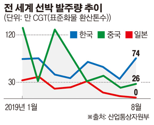 한국 조선업계의 1~8월 수주량은 464만 CGT(표준화물선 환산 톤 수ㆍ부가가치와 건조 난이도 등을 가중한 선박 무게)로 중국(502만 CGT)에 뒤쳐졌다. 다만 5월부터는 월간 수주량 1위를 지키며 격차를 좁히고 있다.