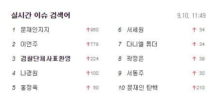 일가 관련 각종 의혹에 휩싸여 검찰의 대대적 수사선상에 오른 조국 법무부 장관에 대한 높은 비판 여론에도 불구하고 전날‘검찰개혁 완수’를 주문하며 문재인 대통령은 그에 대한 법무장관 임명을 강행했다. 이에 조 장관 측 지지자들은 조 장관과 그의 일가를 둘러싼 의혹 및 고소·고발건에 대해 전격 수사중인 검찰을 비판하며 ‘검찰단체사표환영’,‘검찰사모펀드쇼’ 등을 연이어 포털 사이트 실시간 검색어(실검)에 올리며 검찰에 대한 비판 여론을 높이고 있다.