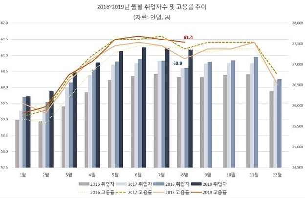 통계청이 11일 발표한 ‘2019년 8월 고용동향’은 경기 회복기 노동 시장이라고 착각할만한 숫자들로 가득차있다. 지난해 같은 기간 대비 취업자수 증가폭은 45만2000명으로 2017년 3월(46만3000명) 이후 2년 5개월만에 가장 컸다. 고용률은 61.4%로 지난해 같은 기간 대비 0.5%포인트(P) 뛰었다. 실업률은 3.0%로 1.0%P 하락했다. 한국은행과 기획재정부가 올해 경제성장률 전망치를 하향조정하는 등 경기가 빠르게 식어가는 것과 대비되는 결과다.
