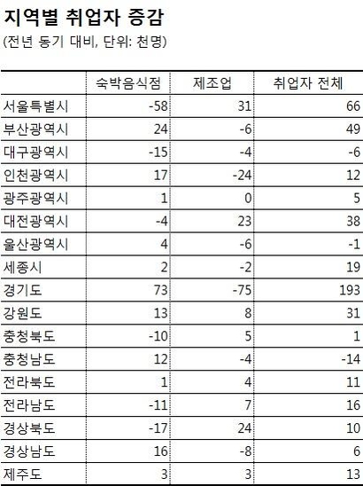 숙박음식점업 취업자가 늘어난 원인은 중국 등 외국인 관광객이 늘어난 영향이 컸다. 한국관광공사에 따르면 1~7월 외국인 입국자는 990만명, 관광 수입은 100억달러로 각각 전년 동기 대비 16.7%, 17.4% 늘었다. 지난 2017년 중국의 사드(THAAD·고고도미사일방어체계) 보복으로 관광 수입이 20.8% 줄어든 것에서 회복하는 양상이다. 부산(2만40000명)과 강원도(1만3000명)의 숙박음식점업 취업자 증가는 해당 시도 취업자 증가의 49.0%와 41.9%를 차지하는 데, 관광객 증가가 기여한 바가 큰 것으로 풀이된다.