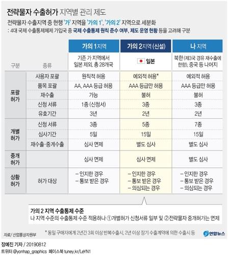 !['백색국가서 일본 제외' 행정예고(서울=연합뉴스) 정부가 한국의 백색국가에서 일본을 제외하는 전략물자 수출입고시 개정안을 행정 예고했다. 사진은 전략물자 수출구분 '가의1' 국가에서 '가의2' 국가로 조정된 일본(빨간원)이 표기된 서류. 2019.8.14 [법제처 국민참여 입법센터 행정예고 공문 캡처.재판매 및 DB 금지]](http://static.news.zumst.com/images/3/2019/09/15/PYH2019081417830001300_P2.jpg)