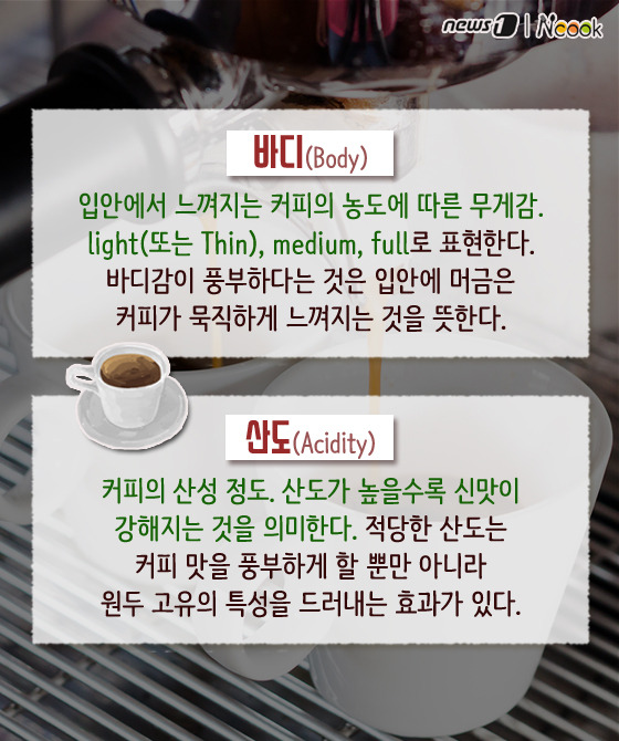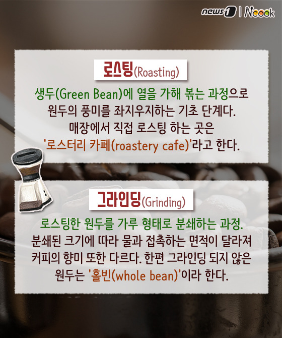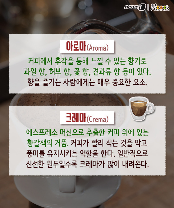 (서울=뉴스1) 박라경 에디터 = 카페에서 커피를 주문하거나 혹은 커피에 관한 대화를 나눌 때 생소한 단어 때문에 당황한 경험이 있지 않은가. 많이 들어봤지만 정확한 뜻을 알지 못했던 용어도 그 의미를 알고 마신다면 커피 맛이 색다르게 다가올 수 있다. 하루에 커피 한 잔은 꼭 마셔야 하는 당신이 알아두면 좋을 기본 용어를 정리해봤다.