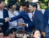 [더팩트ㅣ김세정 기자] 강기정 청와대 정무수석(오른쪽)이 16일 오후 서울 종로구 청와대 분수대 앞에서 열린 황교안 자유한국당 대표의 조국 법무부 장관 임명 항의 삭발식 현장을 찾아 자유한국당 관계자들과 인사를 나누고 있다.