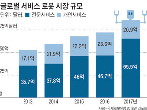 국제로봇연맹(IFR)은 국내 기업들이 잇따라 뛰어들고 있는 서비스 로봇의 글로벌 시장 규모가 연평균 24%가량씩 성장해 2017년 86억달러(약 10조원) 수준으로 집계됐다고 최근 밝혔다. IFR은 이 시장이 물류·의료(전문서비스), 가사 로봇(개인서비스) 중심으로 성장해 2021년 202억달러(약 24조원)에 달해 두 배 이상 커질 것으로 내다봤다.