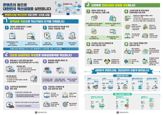 정부가 콘텐츠산업 3대 혁신전략을 발표하고 2022년까지 콘텐츠산업에 1조원 이상 투자확대에 나서기로 했다. 여기에 실감콘텐츠 육성, 신한류 연관 산업 성장 견인 등의 전략을 통해 콘텐츠산업 매출 150조원, 수출액 134억 달러로 성장시킨다는 목표다.