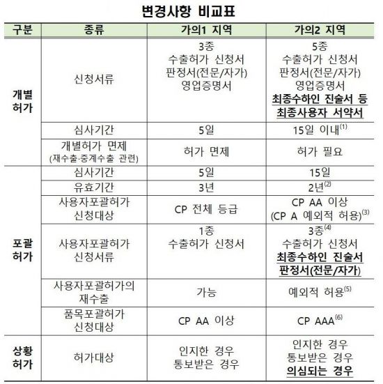 여기에 해당하지 않으면 지금보다 깐깐한 개별수출허가 심사를 받아야 한다. 심사 서류는 3종에서 5종으로 늘어나고 심사 기간도 5일에서 15일 이내로 길어진다.