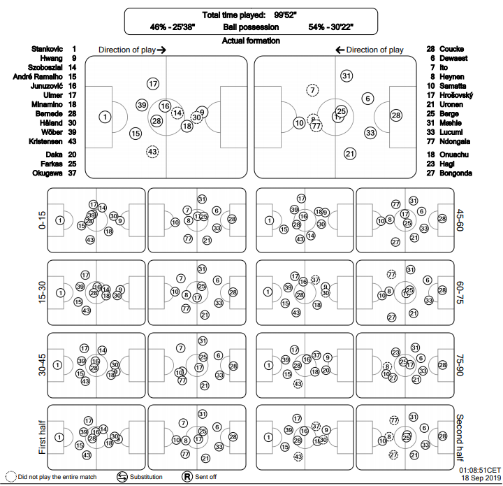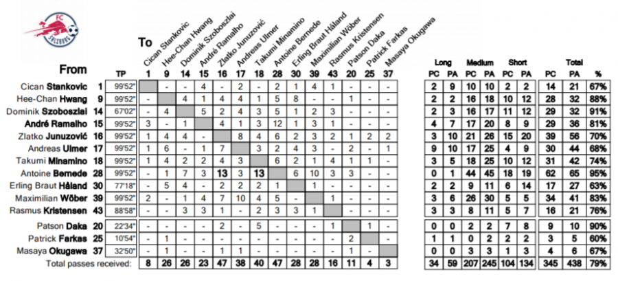 전반 2분 미나미노 다쿠미의 도움을 받은 선제골 장면에서 홀란은 상대 수비 사이 중앙, 문전을 정면으로 볼 수 있는 위치에 있다. 수비수 한 명이 미나미노의 돌파를 막기 위해 생긴 공간으로 이동하며 그리로 흐른 공을 잡지 않고 슈팅해 득점했다.