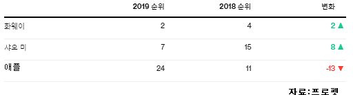도널드 트럼프 미국 대통령의 압박 공세에 직면한 중국 통신장비업체 화웨이 순위가 지난해 4위에서 2위로 올라선 게 대표적이다.