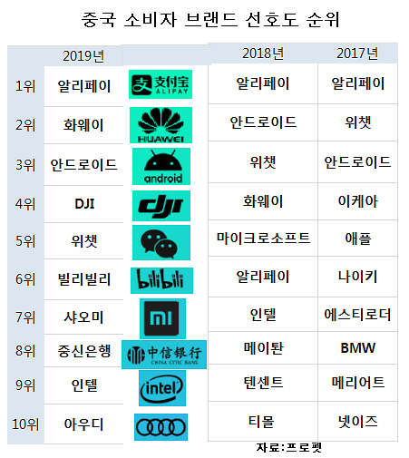 중국 브랜드 선호도 조사에서 1위는 알리페이였다. 알리페이는 2015년부터 5년째 선두를 지켜왔다. 2, 3위는 각각 화웨이와 안드로이드가 차지했다. 4~10위는 DJI, 위챗, 빌리빌리(중국 동영상 스트리밍업체), 샤오미, 중신은행, 인텔, 아우디 순이었다.