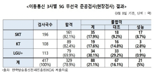 불합격률이 가장 높은 통신사는 LG유플러스로 검사 대상 기지국 113개 중 30.1%인 34개가 불합격했다. SK텔레콤은 196개 기지국 중 17.9%인 35개 기지국이 준공검사에서 불합격 판정을 받았다. KT는 108개의 기지국 중 19개 기지국이 불합격해 17.6%의 불합격률을 기록했다.