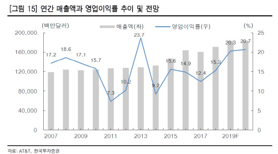 워너미디어 매출은 지난해 하반기부터 반영됐으며, 올해 2분기 워너미디어 매출은 전체의 18.6% 비중을 차지했다. 양 연구원은 “AT&T의 지난해 매출액은 타임워너 인수로 전년대비 6.45 늘어났고 올해에는 7.1% 증가할 것으로 추정된다”며 “영업이익률도 지난해 미디어 손익이 반영되면서 15.3%로 전년대비 2.9%포인트 상승한데 이어 올해 1분기와 2분기에는 각각 16.1%, 16.7%로 더욱 높아졌다”고 설명했다.