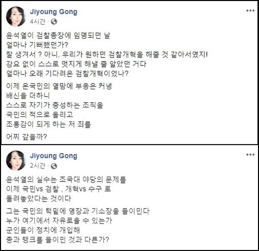 해당 글을 올린 지 약 1시간 후 공지영은 “윤석열의 실수는 ‘조국 vs 야당’의 문제를 이제 ‘국민 vs 검찰, 개혁 vs 수구’로 돌려놓았다는 것”이라고 지적했다.