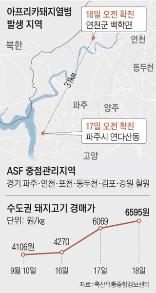 이번에 신고가 들어온 김포 농장은 아프리카돼지열병이 확진된 파주 농장으로부터 약 13.7㎞, 연천 농장으로부터 45.8㎞ 떨어져 있다. 정부는 지난 17일 파주에서 확진 판정이 나온 이후 경기 파주·연천·포천·동두천·김포, 강원 철원 등 6개 시·군을 아프리카돼지열병 중점관리지역으로 지정했다. 중점관리지역에 있는 농장은 3주간 다른 지역으로 돼지를 반출할 수 없고, 지정된 도축장 4곳에만 출하할 수 있다.