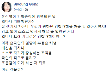 공씨는 이어 조 장관 자택에 대한 압수수색 소식이 들리기 전 “윤석열이 검찰총장에 임명되던 날 얼마나 기뻐했던가? 잘 생겨서? 아니, 우리가 원하던 검찰개혁을 해줄 것 같아서였지! 강요 없이 스스로 멋지게 해낼 줄 알았던 거다 얼마나 오래 기다려온 검찰개혁이었나?”라며 “이제 온국민의 열망에 부응은커녕 배신을 더하니 스스로 자기가 충성하는 조직을 국민의 적으로 돌리고 조롱감이 되게 하는 저 죄를 어찌 갚을까?”라며 윤 총장을 비판했다.