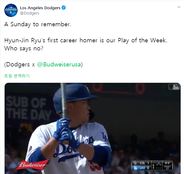 다저스 구단은 공식 SNS에 24일(이하 한국시간) 류현진의 콜로라도전 동점 홈런 영상을 게재했다. 구단은 "기억해야 할 일요일"이라며 "류현진의 커리어 첫 홈런은 우리의 '이 주의 플레이'다. 누가 아니라고 하겠는가?"라고 적었다.