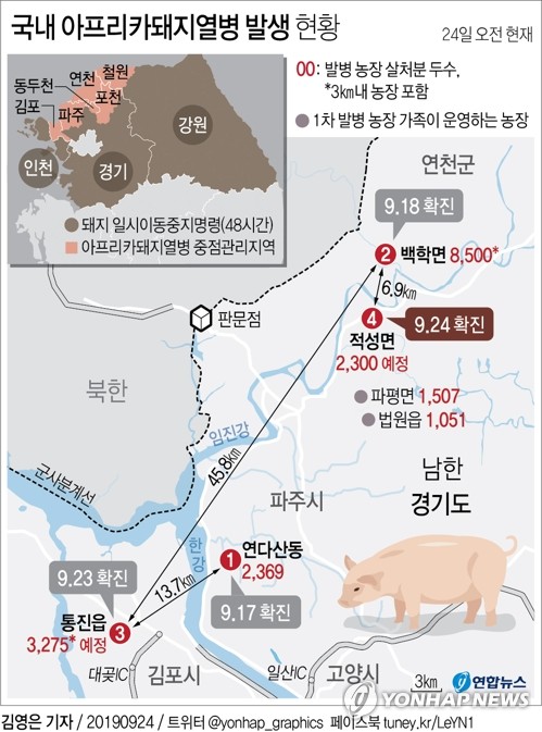 (세종·서울=연합뉴스) 박성진 이신영 이태수 기자 = 아프리카돼지열병(ASF)이 국내에서 처음 발생했던 경기도 파주에서 24일 오전 또다시 ASF 확진 판정이 나왔다.