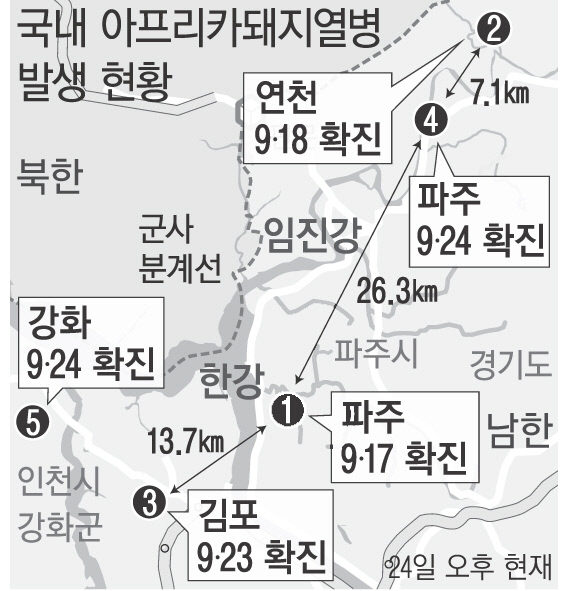 아프리카돼지열병(ASF)이 인천 강화군과 경기 파주시에서 또 발생했다. 이에 따라 국내 ASF 발병 사례는 모두 5건으로 늘어났다. 강화 발생 농가는 정부가 그동안 강력한 방역을 펼쳐온 중점관리지역 밖이어서 ASF가 기존 방역망을 뚫고 전국으로 확산되는 것 아니냐는 우려가 커지고 있다. 당국의 역학조사에서는 ASF의 국내 확산이 농가를 오간 차량들에 의해 이루어졌을 가능성이 있는 것으로 나타났다. 정부는 전국에 48시간 돼지 이동중지명령을 내렸다.