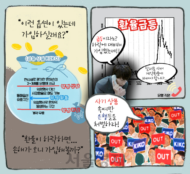 키코(KIKO) 사태는 수출 비중이 높은 기업들이 환율 하락을 대비해 은행과 맺은 옵션형 계약이었습니다. 환율이 일정 범위 안에서 움직일 때 미리 정한 환율에 달러를 팔아 이익을 내거나 손실을 방지할 수 있는 구조였죠. 문제는 환율이 예상 구간 이상으로 오를 때였습니다. 당시 환율이 떨어질 것이라는 예상을 뒤엎고 환율이 급등해 다수의 기업들은 수조원 대의 손실을 입었습니다. 피해기업 919개, 피해금액만 3조1,588억원이었고 피해기업 중 235곳은 폐업이나 워크아웃, 기업회생절차를 감행해야 했습니다. 당시 사태와 지금 다른 점이 있다면 키코가 중소형 기업이 피해 대상이었다며 이번 사태는 노후자금을 투자한 개인도 포함됐단 점입니다.