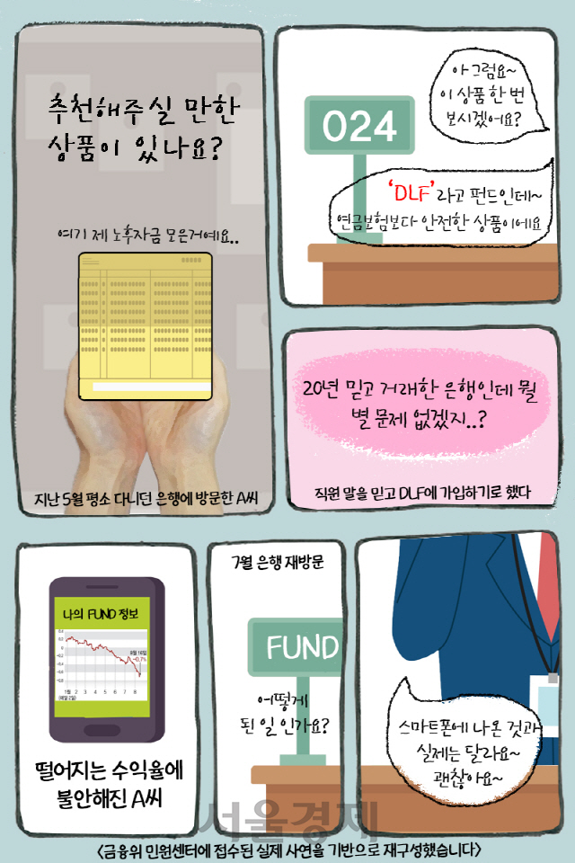 문제가 된 DLS는 각종 투자사들이 설계·발행해 자산운용사들이 사모펀드 포트폴리오에 담아 DLF를 구성했고 은행에서 이 DLF를 가져다 판매했습니다. 은행 창구를 통한 고객들은 “더 나은 수익률의 상품이 있다”는 안내를 받아 ‘예·적금보다는 수익이 좋은’ 펀드에 가입을 한 겁니다. 한 은행 직원은 “DLS 상품을 팔지 못하면 ‘바보’ 소리를 들을 정도였다”며 당시 상품 인기를 증명하기도 했습니다.
