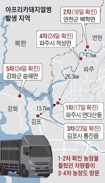 정부의 질병 역학관계 판단이 미흡했던 것이 아니냐는 지적도 나오고 있다. 돼지열병 최초 발병지인 파주 연다산동 농가는 3차 확진 판정을 받은 김포 통진읍 농가와 13.7㎞, 5차 강화 송해면 농가와 21.1㎞ 떨어져 있다. 2차 발병지인 연천 백학면 농가(33㎞ 거리)에 비해 김포, 강화의 3, 4차 발병지와 더 가깝다. 2차 발병지와 4차 발병지(파주 적성면) 사이 거리는 7.1㎞에 불과하다.