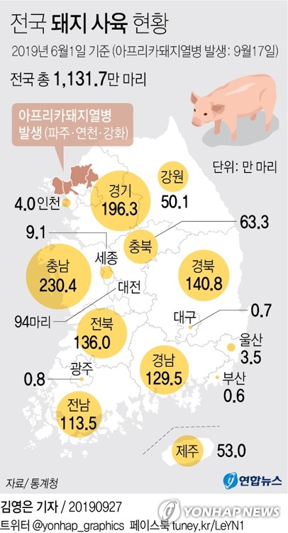이로써 국내에서 발생한 아프리카돼지열병은 총 9건으로 늘었다. 0eun@yna.co.kr](http://static.news.zumst.com/images/3/2019/09/27/GYH2019092700040004400_P2.jpg)