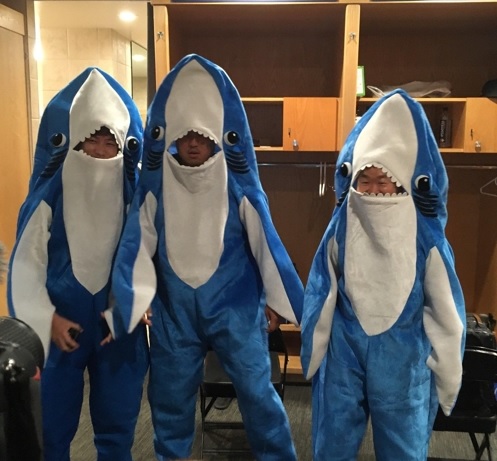 다저스는 27일(이하 한국시간) 샌프란시스코 원정 경기에 앞서 클럽하우스에서 코스튬 파티를 열었다. 류현진은 김용일 트레이너, 이종민 통역과 함께 상어 복장을 하고 미국에서도 인기가 큰 '아기상어' 율동을 펼쳤다.