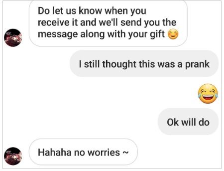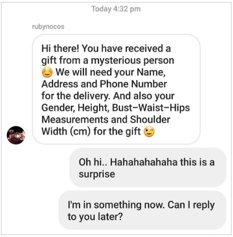 갑작스러운 메시지에 당황한 헬미는 "그분이 나에게 선물을 주는 이유가 뭐냐. 받아도 되는 건지 모르겠다"라며 의심을 감추지 못했습니다. 하지만 쇼핑몰 측은 "걱정하지 마라. 나중에 당신이 선물을 받은 후에 이유를 알려주겠다"고 안심시켰습니다.
