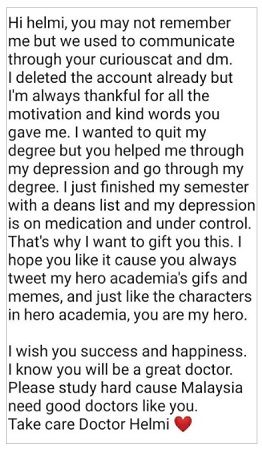 편지에서 여성은 "당신이 기억하는진 모르겠지만, 우린 예전에 트위터로 이야기를 나눈 적이 있다"라며 운을 뗐습니다. 이어 "내가 석사 과정을 포기하고 싶었을 때, 당신이 나의 고민을 들어주고 다정하게 격려해주었다"라며 "덕분에 나는 학업을 무사히 마쳤다. 당신은 나의 히어로다"라고 진심을 드러냈습니다.