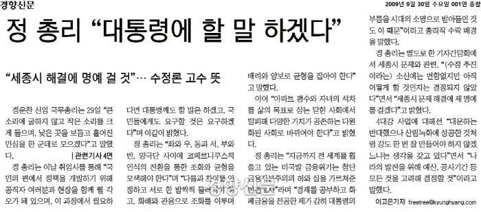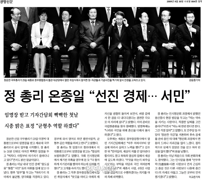 이번 ‘조국대전’과 동일선상에서 비교하기는 힘들겠지만 대통령의 고위공직자 임명은 늘 논란을 낳았습니다. 10년 전 오늘은 정운찬 한국야구위원회(HBO) 총장이 인사청문회 관문을 힘겹게 통과하고 총리 취임식을 통해 “대통령에게 할 말은 하겠다”며 각오를 다졌던 날입니다. 2009년 9월30일 경향신문은 ‘정운찬 신임 국무총리’의 취임 첫날 행보를 다룬 기사 그리고 총리 지명 즈음에 확인된 그의 소신의 변화(?)를 짚은 칼럼 등이 실렸습니다.