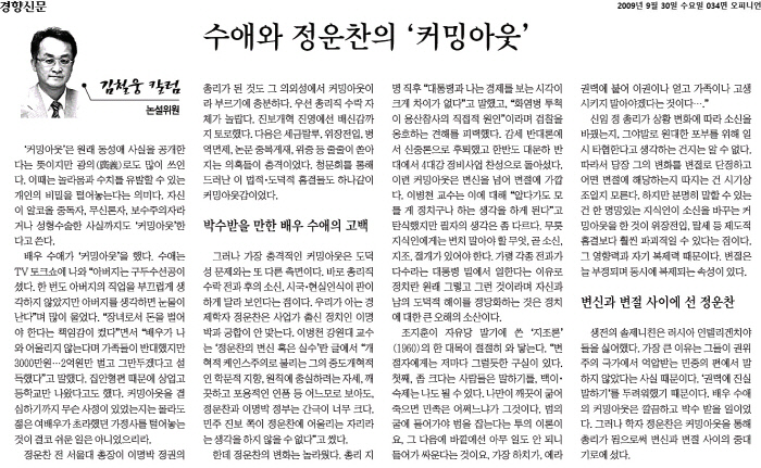 사실 정운찬 총리 취임 국면에서 가장 대중의 이목이 쏠렸던 대목은 그의 ‘변신’ 이었습니다. 그동안 학자로서 ‘정운찬’은 불평등 등의 문제에 관심이 많은 케인즈주의자로 알려져 있었고, 본인도 그런 소신을 조금씩 드러내 왔습니다. 그런데 총리 임명 이후 정 전 총리는 “대통령과 나는 경제를 바라보는 시각에 크게 차이가 없다”거나 용산참사에 관해서는 “화염병 투척이 참사의 직접적 원인”이라면서 정부와 검찰을 옹호하는 발언으로 많은 사람을 놀라게 했습니다. 대운하 사업엔 반대했던 그가 4대강 사업엔 찬성한다고도 했고요. 그의 이런 변화를 ‘커밍아웃’ ‘변신’ ‘변절’ 등에 빗댄 칼럼도 10년 전 오늘 경향신문에 실렸습니다.