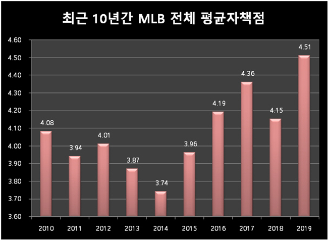 게다가 추세라는 측면으로 봤을 때, 최근 MLB 투수들의 평균자책점은 점점 올라가고 있다. 특히 2014년 이후 최근 5년간 그 현상은 더욱 두드러지고 있다. 디그롬과 스넬, 클레이턴 커쇼 등과 같은 투수들이 최근 수년간 1점대 평균자책점을 기록했던 시즌으로 인해 착시현상이 생겼던 것뿐이지 실제 최근 MLB 투수들의 평균자책점은 가파르게 상승하고 있으며, 1990년대 후반과 2000년대 초반까지 이어지던 타고투저 현상이 다시 도래한 듯한 상황이다.