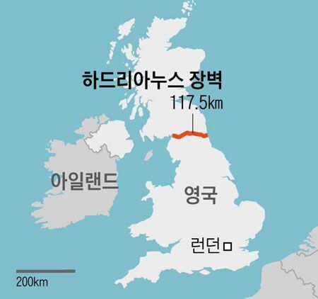 영국을 여행하기에 제일 좋은 계절은 초여름이다. 비와 안개의 섬에 햇살이 가득해진다. 본격적인 더위는 아직 오지 않았고, 바람은 가을인 듯 시원하다. 매일이 푸른 하늘인데, 예쁘게 구름이 수놓여 있다. 만약 영국에 갈 일이 있으면 무리해서라도 6월에 가려고 기를 쓰는 이유다. 그렇다고 영국 전역의 6월이 그런 것은 아니다. 같은 섬에 있지만, 남쪽 잉글랜드와 북쪽 스코틀랜드는 다르다. 북쪽은 좀 더 을씨년스럽다. 비도 종종 온다. 풍광은 날씨와 상관없이 서늘하고 황량하다. 그 변화의 경계에 선이 있다. 끝이 보이지 않는 장벽이다. 거대하지는 않지만 왜소하지도 않다. 로마 시대에 지어졌다는 사실을 믿기 어려울 정도로 잘 보존돼 있다. 그래서일까? 관광객은 물론이고 장벽을 따라 하이킹을 즐기는 사람도 많이 볼 수 있다. 장벽 사이로는 로마 군단이 머물렀던 요새와 당시의 유물을 전시 중인 미니 박물관들도 있다. 생각보다 유물이 많고 수준이 높다. 북해 쪽 타인강 하구의 뉴캐슬에서 아일랜드 앞바다의 솔웨이 만까지 이어진 117.5㎞의 장벽. 로마제국의 북방 경계다. 지금도 외진 이곳에 이 거대한 유적을 남긴 사람은 하드리아누스 황제였다.