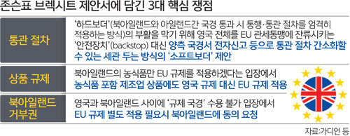 이번 ‘존슨표 브렉시트 제안서’의 핵심은 북아일랜드(영국령)와 아일랜드(EU 회원국) 간 국경과 관세, 규제 등 문제의 대안이 담겼다는 점이다. 이 지역은 서로 국경을 개방한 상태로 EU의 관세와 규제를 공유해온 만큼 영국이 EU를 이탈하면 각종 이권이 엇갈리기 때문이다. 양측은 이 문제를 두고 최근까지 양보 없는 대치를 벌여왔다.