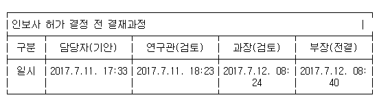 담당 과장은 다음 날인 7월 11일 오전 8시 24분 출근하자마자 검토를 마치고 곧바로 담당 부장에서 올렸으며 담당 부장은 16분 후인 오전 8시 40분에 전결처리로 결재했다.