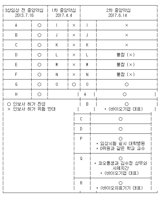 2017년 4월 4일 인보사 허가 여부를 심의할 1차 중앙약심이 열렸지만 참석 위원 7명 중 1명만 찬성하고 6명이 인보사를 허가하면 위험하다고 반대해 시판이 불허됐다. 하지만 2개월여 뒤인 2017년 6월 14일 열린 2차 중앙약심에서는 허가 쪽으로 바뀌었다.