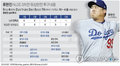 류현진은 7일(한국시간) 미국 워싱턴 D.C. 내셔널스파크에서 열린 워싱턴 내셔널스와의 2019 미국프로야구 내셔널리그 디비전시리즈(NLDS·5전 3승제) 3차전에 선발 등판해 5이닝 동안 안타 4개를 맞고 2점을 줬다.