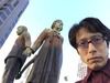 일본 왕족 가문의 극우논객 다케다 쓰네야스. 미 샌프란시스코의 소녀상을 배경으로 사진을 찍은 뒤 위안부를 부인하는 글을 트윗에 올렸다. [본인 트위터]