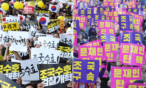 여야 모두 조국 법무부 장관 지명 이후 두 달 가까이 대규모 집회 등을 통해 핵심 지지층을 끌어안은 모양새다. 여권은 조 장관 지명 이후 검찰과 야당, 언론의 공세에 노무현 전 대통령을 떠올린 지지층이 결집했지만, ‘문재인정부가 공정·정의의 가치를 외면했다’며 실망감을 느낀 중도층 일부는 이탈했다는 분석이다. 내년 총선을 바라보는 민주당 현역 의원들 사이에선 “조국 사태로 지역구 분위기가 심상치 않다”는 말이 흘러나온다. 한국당의 경우 조국 정국이 분열됐던 범보수가 다시 결집하는 계기가 됐지만 각종 여론조사에서 지지율이 20∼30% 박스권에 갇혀 위기감이 고조되고 있다.