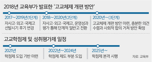 당정청 “자사고·외고 등 2025년 일반고로 일괄 전환” / 자사고 ‘이중지원 금지’ 위헌 결정 / 재지정 평가도 소송전 끝 무력화 / ‘조국 사태’로 공정성 논란 재점화 / 시행령 개정으로 돌파구 만들어 / “정권 따라 입시 정책 자꾸 바뀌어” / 수험생·학부모 불만… 진영 갈등도