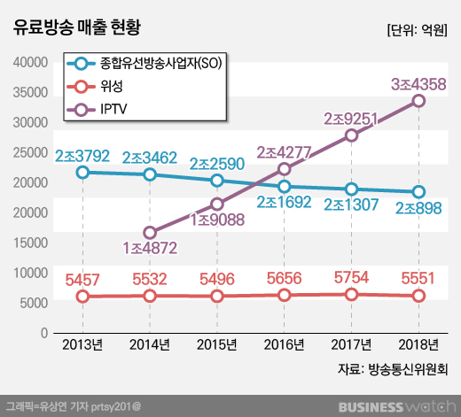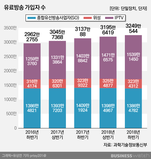 국내 유료방송 가입자수는 지난해 하반기 기준 3249만명으로 증가율이 조금씩 떨어지는 추세다. 지난 3년간 유료방송 가입자의 전년비 증가율은 6.3%(2016년), 5.9%(2017년), 3.6%(2018년)로 낮아지고 있다.
