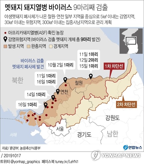 ![아프리카돼지열병(ASF)에 감염된 멧돼지 폐사체 발견지점. 8번이 연천, 9번이 파주.[환경부 제공]](http://static.news.zumst.com/images/3/2019/10/17/AKR20191017120951004_01_i.jpg)