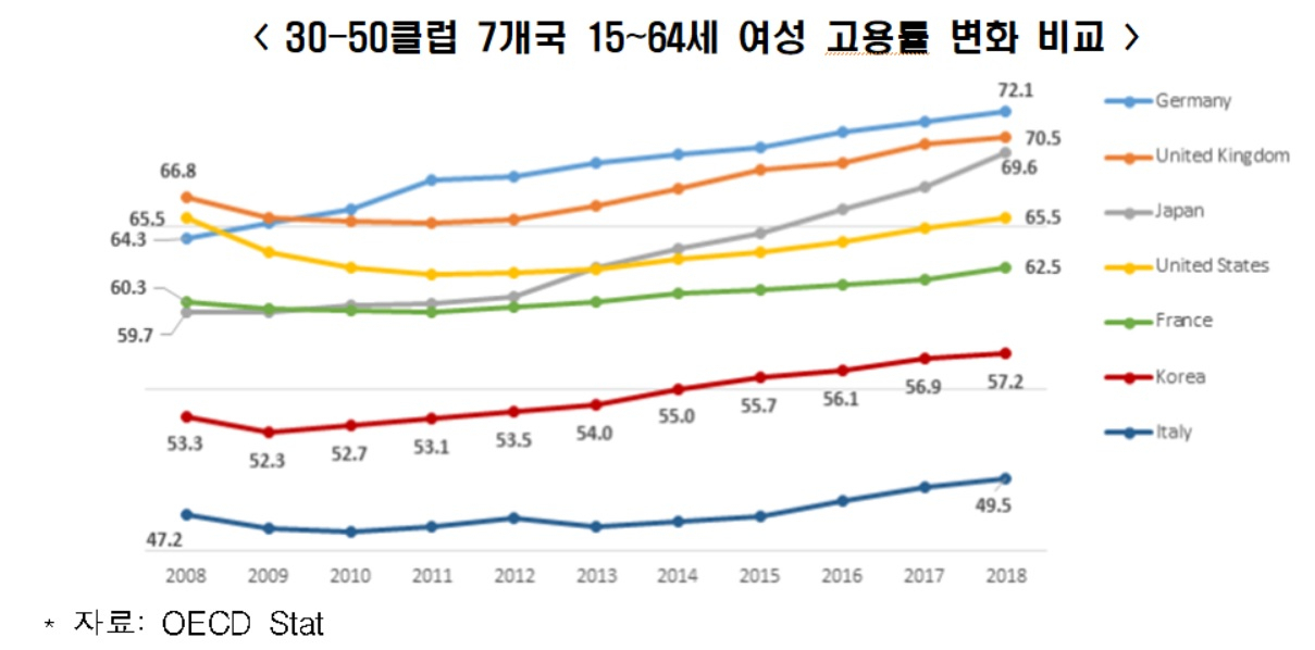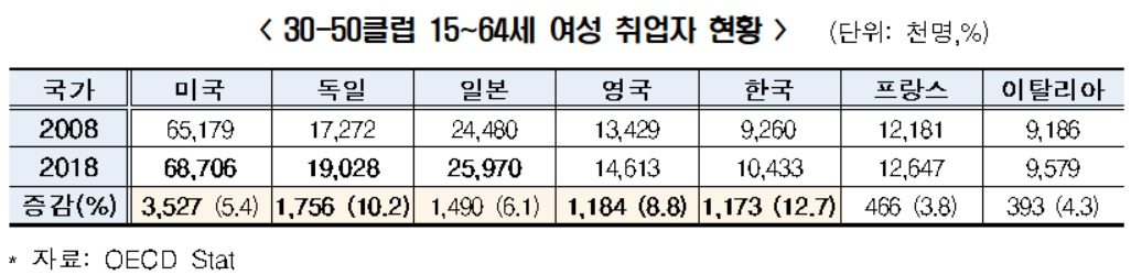 지난 10년간 15~64세 여성 취업자 수는 미국 352만7000명, 독일 175만6000명, 일본 149만명 순이었고, 한국은 117만3000명으로 뒤를 이었다. 취업자수 증가율은 우리나라가 12.7%로 7개국 중 가장 많이 상승해, 독일 10.2%, 영국 8.8%보다 앞섰다.