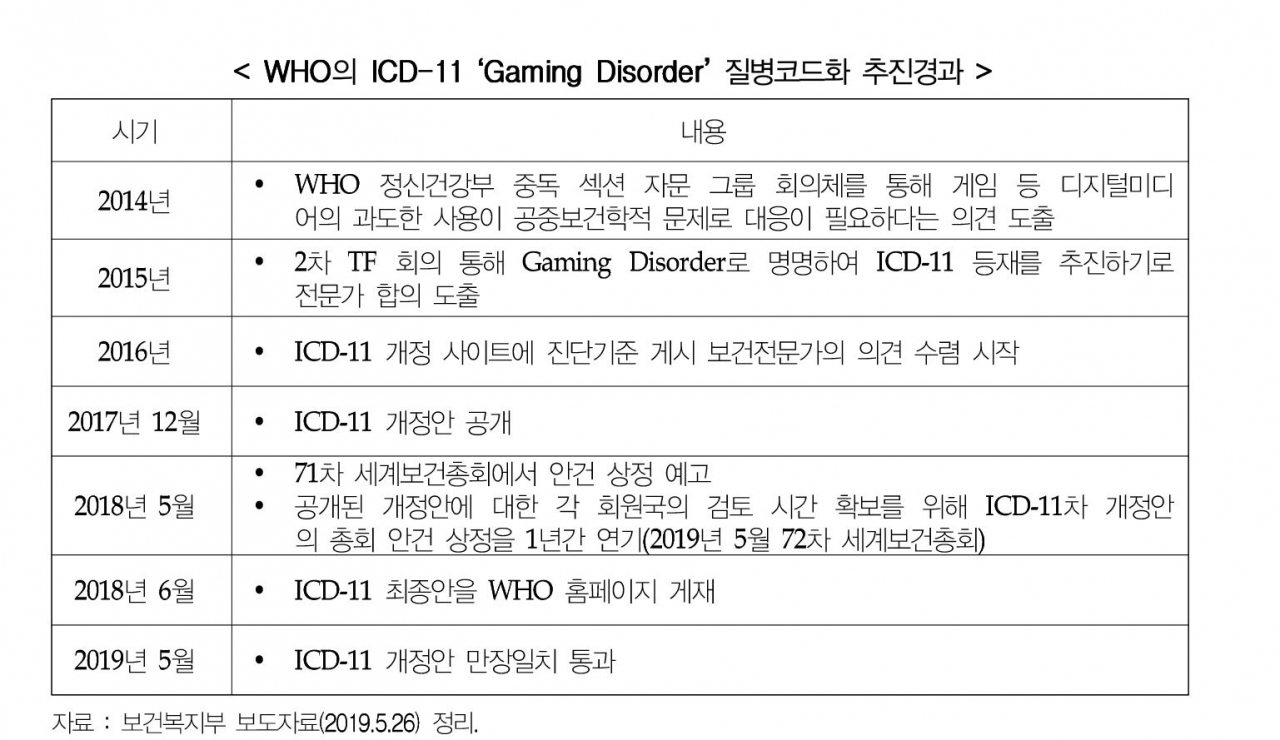 세계보건기구 게임 중독 질병코드 분류 결정 이후 문화체육관광부와 게임업계는 게임에 대한 부정적인 인식 확산과 규제 강화 등으로 인한 산업 침체를 우려하고 있다. 보건복지부와 의료계는 반면, 국제질병표준분류기준 발효를 대비하여 총리실 산하 국무조정실을 중심으로 민관 협의체를 추진할 것을 발표하는 등 반응이 크게 상반된다.