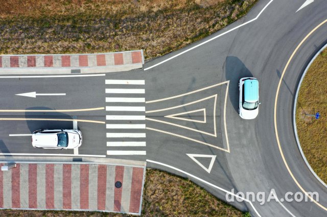 # 현대모비스 자율주행 시험차 엠빌리 두 대가 순차적으로 자율주행을 시작한다. 선행차량이 카메라, 레이더 등 자율주행 센서를 통해 확보한 정보들은 실시간으로 지도에 반영돼 후행차량에 전달된다. 선행차량이 샛길로 들어서 공사구간을 발견하고 멈춰 서자, 불과 수십 미터 뒤에 있던 엠빌리는 이 정보를 바탕으로 최적 경로를 실시간으로 수정해 우회 주행한다.