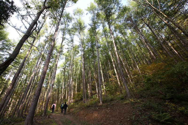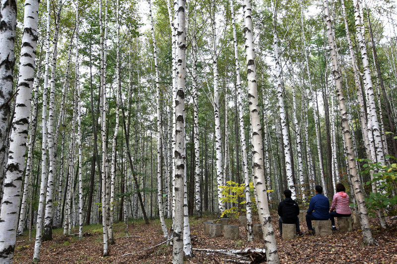 완만한 흙길을 소풍 가듯 내려가다 보면 다시 사람 살던 마을 터가 나온다. 오후 4시10분, 둘레길과 무릉도원길 갈림길에서 오른쪽 ‘제3의 길’로 400m 걸어 올라갔다. 은백색 줄기를 길게 뻗은 자작나무 숲과 초록 잎이 건재한 낙엽송 군락지가 대결하듯 마주 보는 사잇길이다. 그중 약 4만㎡(1만2100평) 땅을 빽빽하게 채운 자작나무 숲은 옛 화전민들이 살던 마을이라고 한다. 2014년부터 ‘하늘길’ 조성에 참여한 강원랜드 시설관리팀 함성욱 대리는 “자작나무숲 일대는 원래 화전민 마을과 숯 가마터, 더덕밭이 있던 자리였다”며 “화전민 이주 정책 이후 정부에서 자작나무를 심어 숲을 조성했고 추후 강원랜드가 추가로 심었다”고 전했다.