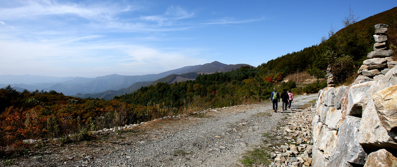마을 사람들은 마천봉에서 흘러내리는 계곡을 ‘무릉계곡’이라 불렀다고 한다. 무시로 지나치는 계곡인데도 볼 때마다 예뻤나 보다. 무릉계곡 끼고 걷는 무릉도원길은 파란 하늘을 수줍게 가린 나뭇가지들마저 정갈하다. 길 마다 색의 향연이다. 노랗고 붉은 단풍 숲을 지나면 초록 낙엽송 길이, 다시 은백색 사스래나무 길이 이어진다. 길가에 그루터기만 남은 아름드리 고목은 포동포동한 에메랄드빛 이끼로 뒤덮여 있다.