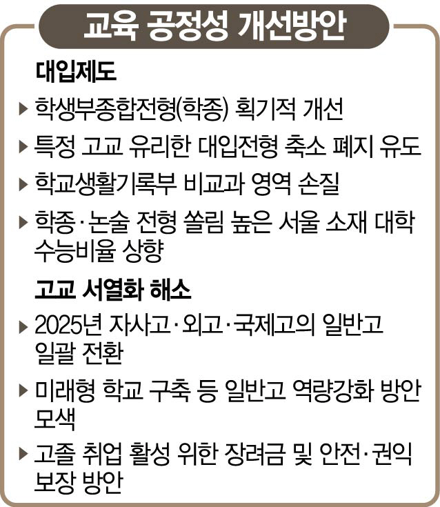 정부가 교육 공정성 강화를 위해 2022학년도부터 서울 주요 대학의 정시모집 대학수학능력시험(수능) 전형의 비중을 높이고 2025학년도부터는 자율형사립고(자사고)와 외국어고, 국제고를 일반고로 일괄 전환하는 방안을 확정해 추진한다.