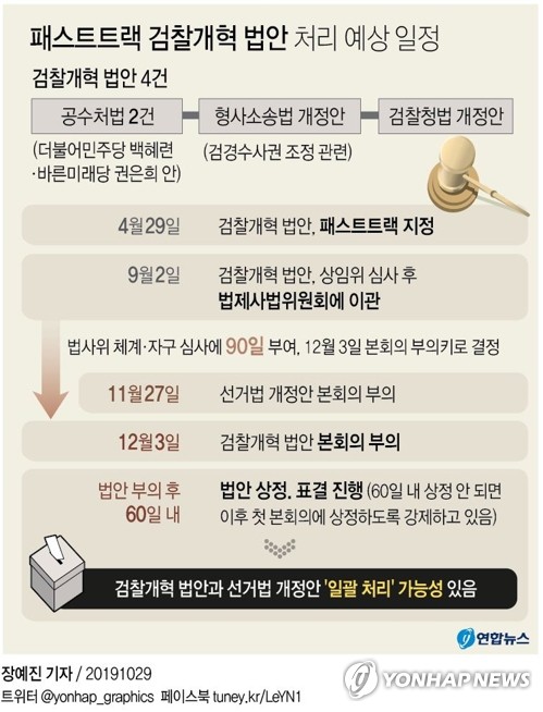 검찰개혁 법안은 예고대로 12월 3일 부의되며, 현재 체계·자구 심사를 위해 법제사법위원회에 계류 중인 선거제 개혁안, 즉 공직선거법 개정안은 오는 11월 27일 부의될 예정이다.