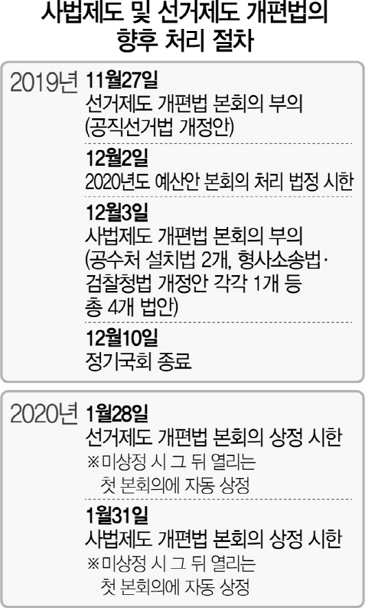 민주당은 그동안 법사위 고유법의 경우 체계·자구심사를 별도로 거치지 않는 것이 국회 관행이라며 4월30일 패스트트랙으로 지정된 사법제도 개편 법안을 그로부터 180일이 경과한 이달 29일 부의해야 한다는 입장을 견지해왔다. 반면 한국당은 사법제도 개편 법안도 법사위가 90일 동안 체계·자구심사를 한 뒤 내년 1월29일 부의하는 게 옳다고 주장해왔다.